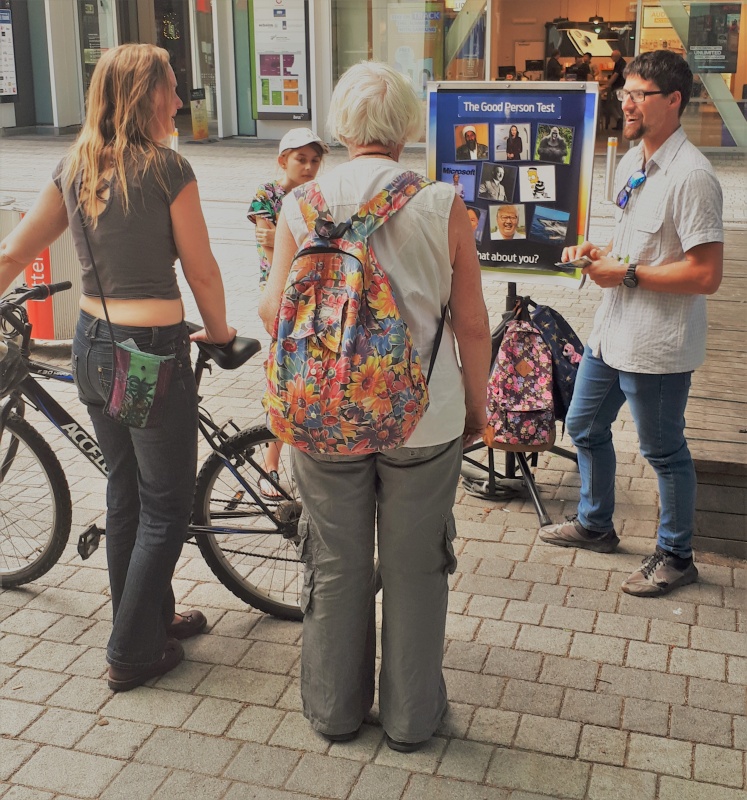The last one was with a young man who wasn’t really keen to talk, and yet stuck around to engage with me. It turns out he was a muslim. He was challenged about the problem of how God can give justice and mercy - before he moved on to catch his bus.