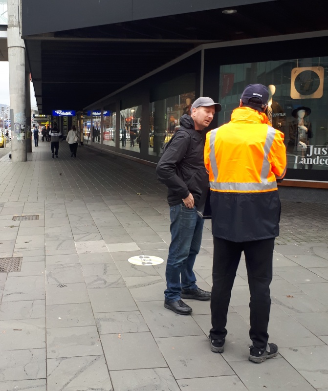 We moved to Cashel Mall and I got into a conversation with a guy who just wasn’t sound in the mind. He started talking about how he had the power to kill people. I told him if he keeps talking like that I’ll call the Police. Gratefully he left me alone after that, but then about ten minutes later he assaulted a homeless guy! Andy witnessed it, and called the Police. Before the Police came, there were some intense follow up exchanges that was causing quite a scene. I was very grateful when the Police arrived! Andy had a great conversation with one of the other witnesses (pictured).