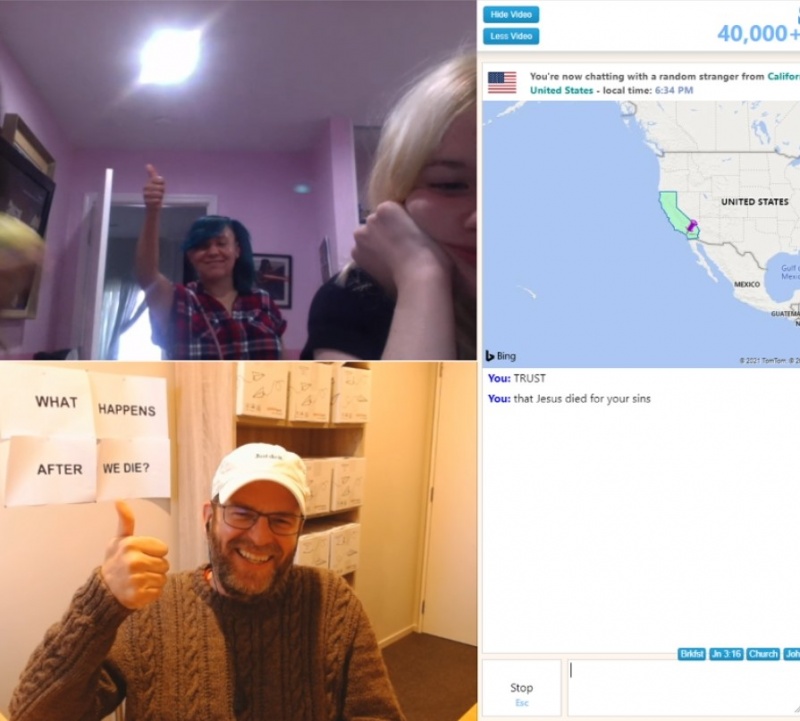 My very first chat back was wonderful. It was with a guy from Romania. He seemed deeply impacted as I took him through the law. But then (or maybe because of this) he grasped the gospel very quickly. It turned into a long chat, over thirty minutes. So good to be back into it!