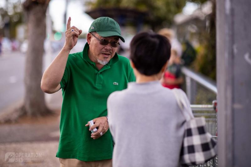 8) An Asian couples took the tract with a friendly gesture but was in a real rush to stop.