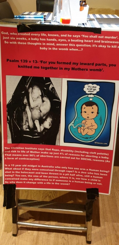 After last weeks ruling in New York about Abortion now being allowed up to the third trimester/ 40 weeks, I had a strong desire to want to preach about this absolutely sickening bill that allowed the murder of the unborn, and so brought a poster I had made a while ago but never really used. I read from Psalm 139 and preached for around 20 minutes that life started from conception and that therefore abortion was murder and that over 96% of abortions were for social reasons rather than rape or medical risk to the mother, and so abortions was being used as a means of contraception rather than the baby being given for adoption, and that only God could forgive murder and the gospel was the only way for peoples sins to be washed away, what ever they were, even if people walking past had an abortion in the past they could be forgiven because of what Jesus had done for sinners. I said that any guilt and shame that people tried to cover up through drink or drugs or wrong relationships could not wash away a guilty conscience but only the blood of Jesus could restore their relationship with God.