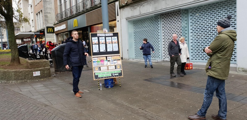 On Saturday 12th January, George, Harry and myself met at 11.30am in the top of the city Centre for outreach. This was the first one we had done collectively in the New Year, and I believe all of us have had different conversations individually with unbelievers in our day to day work before Christmas. I am quite prone to buying things on Facebook Marketplace and never like buying anything new if I can buy it cheaper on there first, and this has led to many chats with people, particularly when after exchanging 'real' money for the item, and then asking if people have any change for a million pound note tract. This has been a great way to share the gospel with people and give them a card for our church with some good solid Bible websites on, (of course one being the 'operation513.com' site) with the gospel message on the back.