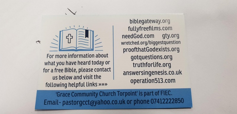 The weather was kind to us and many tracts were handed out to passers by, with us hopefully planning to go to Plympton and Exeter next week for outreach which will hopefully be good, as well as Simon and I making some new A2 posters for people to read and a 'good person test' flip chart.