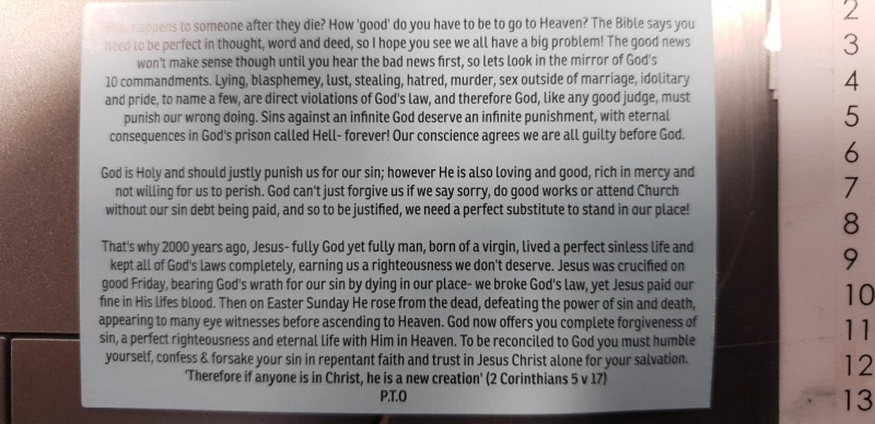 I was worried a passerby may try to pick up on the verse about homosexuality, but was fine and a few people had stopped to listen who we tried to give tracts to and speak with afterwards, one older man in particular whose brother had formerally been a street preacher but who himself did not believe in a God due to all the wars etc around us.