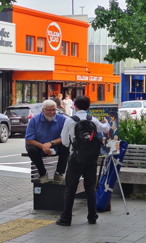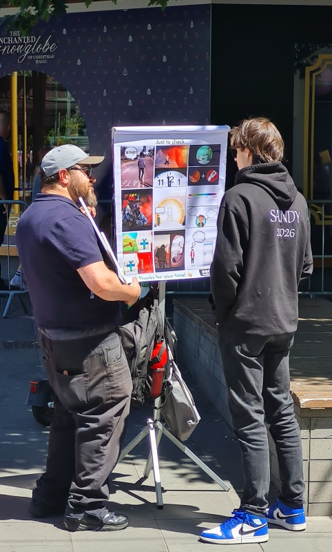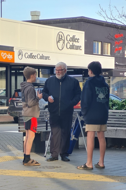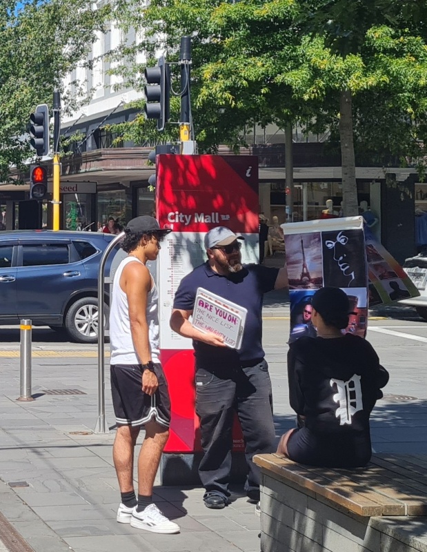 I enjoyed going through the photos for this month's report. There weren't as many as I haven’t been on the streets as much as usual, and all the photos I had were from the Riccarton outreach. All 4 photos (that I’ve included) were taken on the same spot. Roger, with his flip chart. What I like about it is that, as you flick through the photos, it makes you realise how many people you can reach just by going to the same spot for a couple of hours each week. Sure, 1 week might be a bit slower than the next week, but, if you are diligent, then over time you can reach a lot of people.