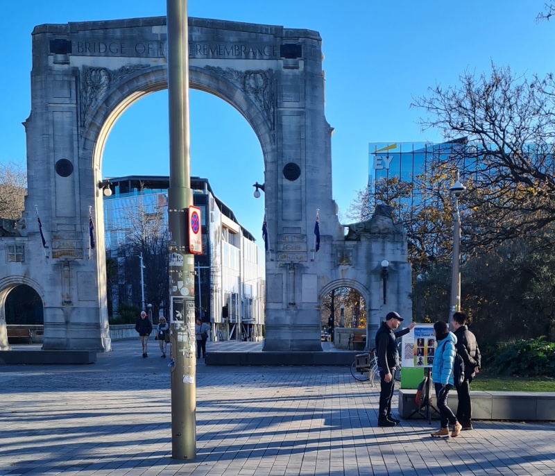 By this stage Andy and Roger had arrived. Roger set up his chart, and then I decided to go for a wander to see who I could talk with. I had barely moved down Cashel Mall when two young ladies stopped to chat. Apparently they had been at some protest in Cathedral Square. Ignoring that, I swung the conversation to the most important issue: what happens after life. One of them had studied religious philosophy and uni - so I asked her what Christians have to do to get to heaven. I wasn’t surprised when she said, “be good” – wrong answer! So, I corrected her, and then moved into the building / builder analogy. She was impressed by that. But, sadly, she wasn’t interested in continuing the chat and needed to go. Both girls accepted tracts as they moved on.