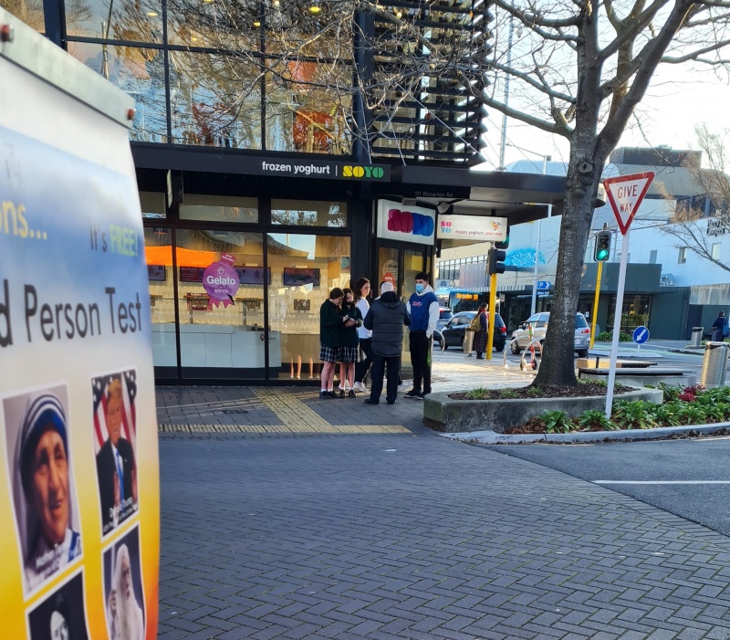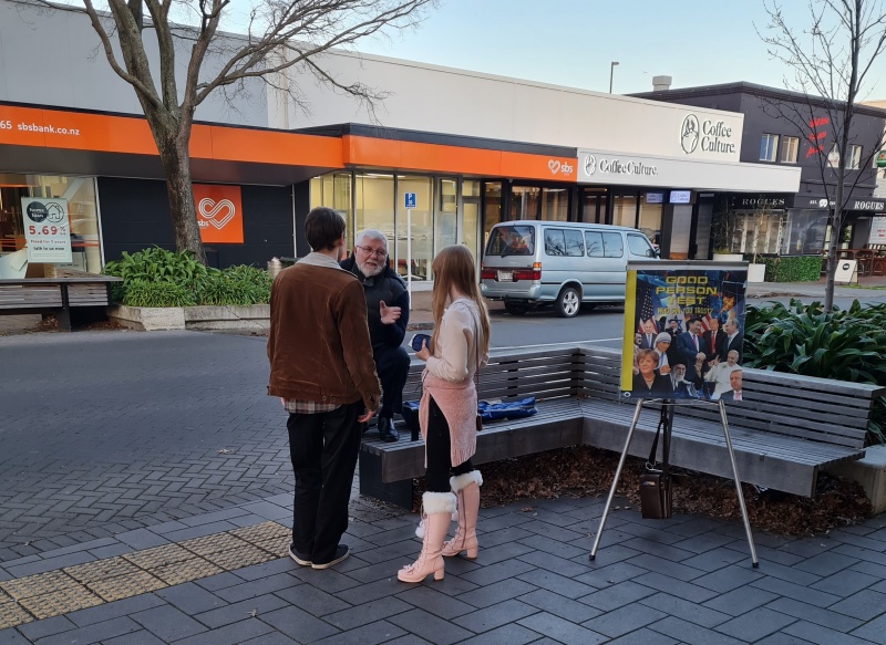 Saturday’s outreach was amazing! The sun was out and melted the frost. It was so good having Mitzi join me again in Riccarton. I had the “good person test” flipchart up, and it attracted a lot of attention.
