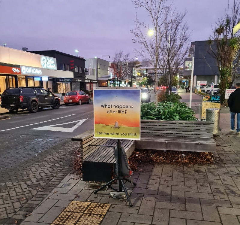 Not long after he left, I had 5 Christchurch Boys High School guys stop to chat. The conversation was going well, where I was working on getting them engaged on the important topic of what happens after life, when suddenly a lady stopped and interjected herself into the conversation. The things she was saying were abrupt, and everyone became uncomfortable. Amazingly, the kids hung around for a bit. But eventually they left. I think the lady was happy, because she wanted to talk with me. Sadly she was drunk. She called herself a satanist. She talked about her life, and all the terrible things she had done. And then, amazingly, she declared how good of a person she was! She wasn’t in a stable state of mind, and so I had to be very careful in how I said what needed to be said. But I was faithful in explaining how she is not good, and how she deserves hell. At this point she started talking about how she had just stolen things from Riccarton Mall! She even showed me these items. I told her she needed to take them back. She refused, and then continued to talk about how unfair life is, and how all her problems were the fault of others. So sad. Thankfully the long chat came to an end. I touched on the gospel, but she really wasn’t read for it. So I gave her two types of gospel tract. I was surprised when she accepted them, and tucked them into her bag. God willing, she will eventually read them, when in a better state of mind. She left. But she came back at least 2 more times. The first time it was to try to give me the things she had stolen - maybe out of conviction? And the 2nd time, she interrupted another conversation I had started with an elderly lady who didn’t believe in God.