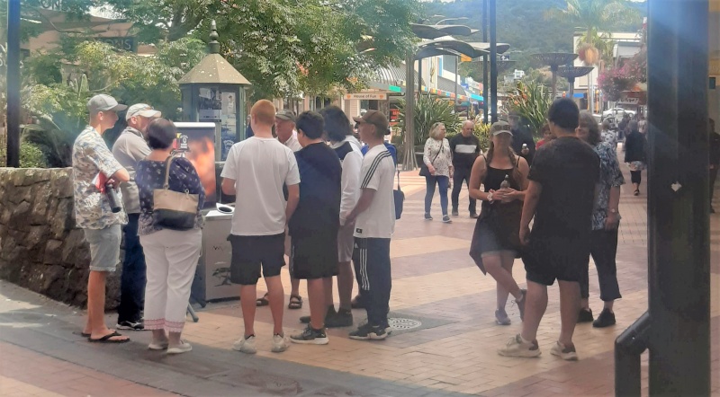 Then a group of teen guys came past - including one I had talked to a previous day.  I asked if they wanted to do the good person test, they were keen, and suddenly I was focusing on four of these guys, plus some Christians keen to see what they had been learning in action (pictured).  It was an amazing conversation, where almost every page of the flip chart was utilised.  They came to understand the gospel (checking questions confirming), and were challenged to respond after counting the cost.  One of the guys was asking good deep questions, showing his engagement, e.g.: “Why is God allowing Covid?”.  And the crowd gathered a crowd, I had multiple people stop and listen to part of the conversation - including a lovely lady - elderly Maroi lady, dressed up fancy.  She had a mixture of concentration and laughter as I engaged with the boys.  She even got involved by answering some of the questions herself.  Half way through she had to go, but she thanked me, and took a tract.