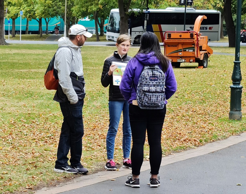 Damien is a Christian who joined us yesterday for lunch, and today he was able to make it for the first half hour or so of the outreach - he was keen to go through the flip chart.  As I was showing it to him, a fish swam past.  I cast my line by asking if he had a minute for a question - a deep one.  He was keen, and so I invited him to try the good person test - a great opportunity for Damien to see it in action!  And it sure was.  The young man was a student from Syria and a Muslim.  We went through the law and the gospel.  He understood it very quickly, but then started gently resisting it.  I had already worked through all the ways people think they can be forgiven, but won’t actually work: good outweighing bad, saying sorry, prayer.  So in his resistance, he tried to raise these reasons and quickly realised he was backed into a corner with the only escape being Jesus.  He softened and said he is currently researching these things.  So I pointed him to the Bible and to Cornerstone International Bible Church (which Damien is a part of) - he seemed very keen.  It was a great chat.