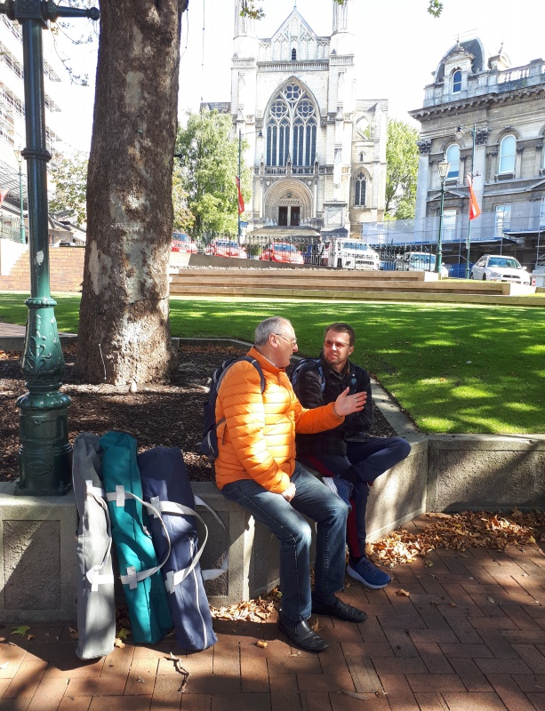 We had lunch at the Square (pictured) where John joined us - he is new to us and joined for some training (pictured with Andy in gospel conversations).  We didn’t open air preach today, instead moving back to Cashel Mall for the afternoon of outreach.  Roger and Graeme joined us, and so did Keith for a while.  The afternoon was a bit slower and harder than the morning.  I had a period where I experience a fair amount of drive by hate from those walking past.  Yet there were many gospel opportunities!