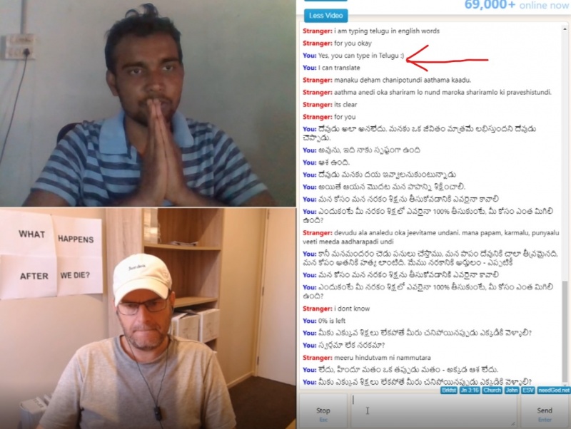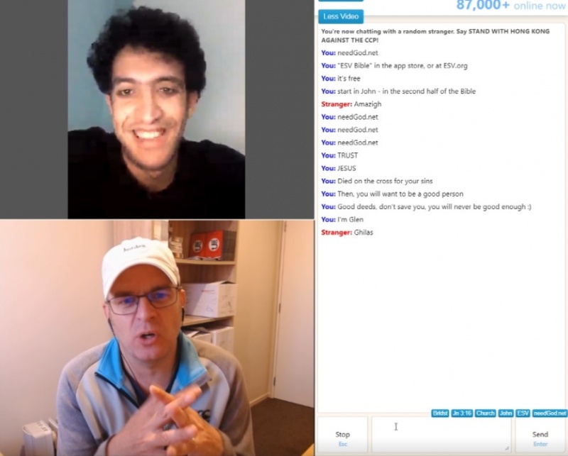 My second and last chat was reasonably good. I had a few false starts to start with - I was even connected with a couple of guys from NZ - that doesn’t happen often. But the main chat was with a couple of guys - one of whom said you have to be perfect to go to heaven. He failed the perfection test and came to hear the good news! He slowly started to grasp the gospel. He had two penny drop moments - as his understanding grew. The first was when he first realised salvation was a gift, the second was during a checking question when the point was nailed home. I leave them in God’s hands.