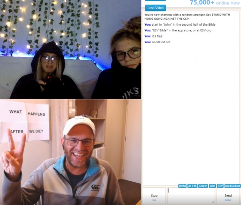 I was online on Saturday for three hours. I had a lot of chats - 12 in total. One of them started with two girls asking me to wave to their TikTok followers - one had a mobile phone and was recording me. So I waved and simply asked them (and their followers) what they thought happened after they died. She kept recording as I took them through the law and the gospel - it was a great chat (pictured)!
