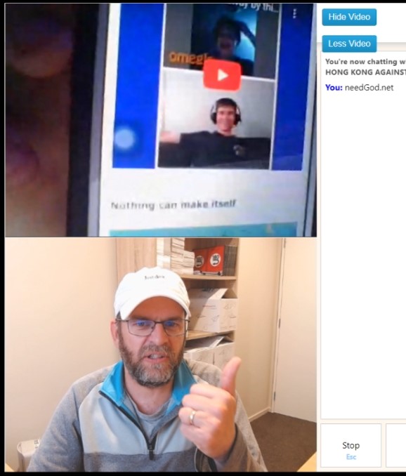 The first was with a guy who looked suspiciously naked from what I could tell at the edges of my video shield. Normally people like that take one look at me and disconnect. But strangely he didn’t. I expected him to leave at any second, so I just started trying to share as much as I could about God before he left. To my surprise, he started responding via text. He said: “I’m practicing my posing for a bodybuilding competition”. So I asked him if he believed there was a God. He responded with “yes of course”. And we were into a discussion! Safe to say, I kept my video shield up! I was able to take him through the law and the gospel. It turns out he had a Muslim background. He gently resisted initially, but to my surprise he softened. At the end he said: “Yes I see ur point”. And then when I asked if he could see how this is good news, he said, “yea def”. He received a link to needGod.net.