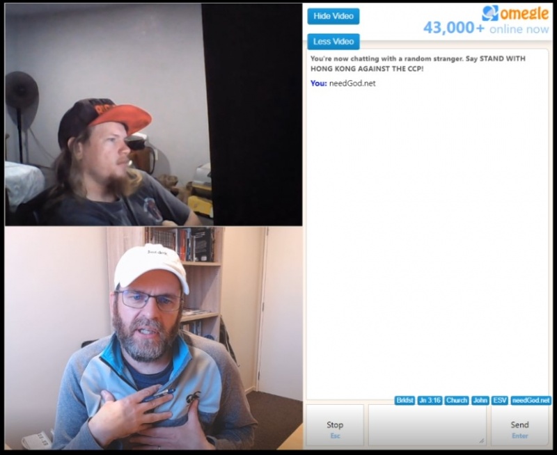 Someone with no video also responded via text. They believed in God, heaven and hell. I started on the law. They denied stealing, and then went silent but didn’t disconnect. I continued through the law but they disconnected before I could share the gospel.