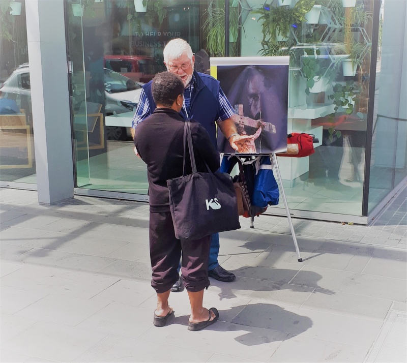 There were many people in Cashel Mall hunting Boxing Day sales. A team of three set up flip charts to have gospel conversations with any willing to stop.