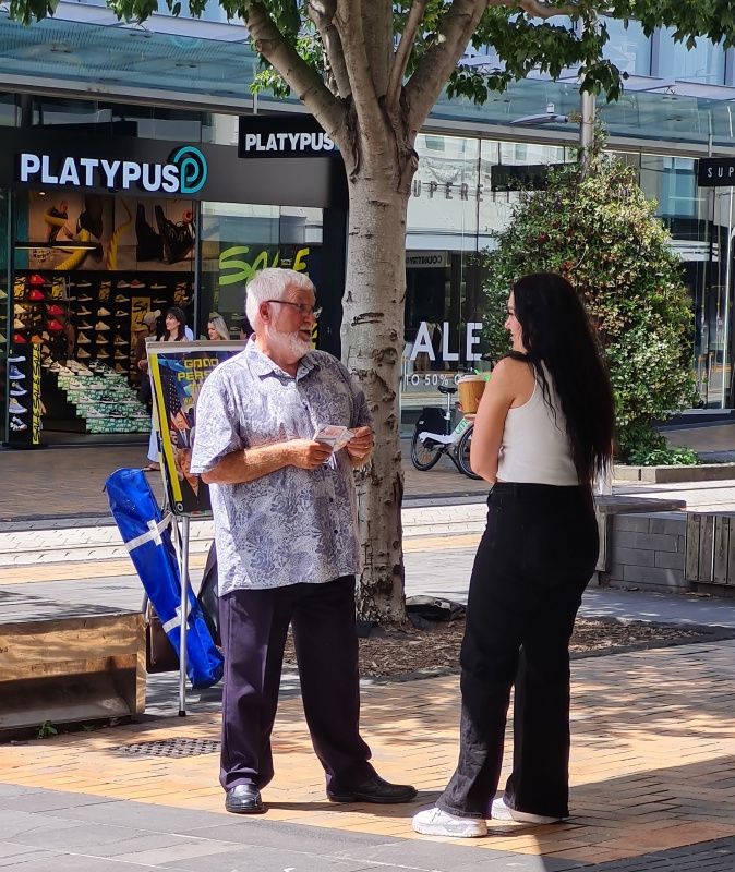 Back in Cashel Mall, I was still handing out tracts when an older gentleman stopped to engage. It was a wonderful opportunity. He had been wrestling with the issue of evolution vs creation - his resolution? There must be God. He was familiar with Christian teaching, but sadly he considered himself a very good person. He was resistant to the law, and yet he was open for me to labour with him about it. He also heard the gospel.