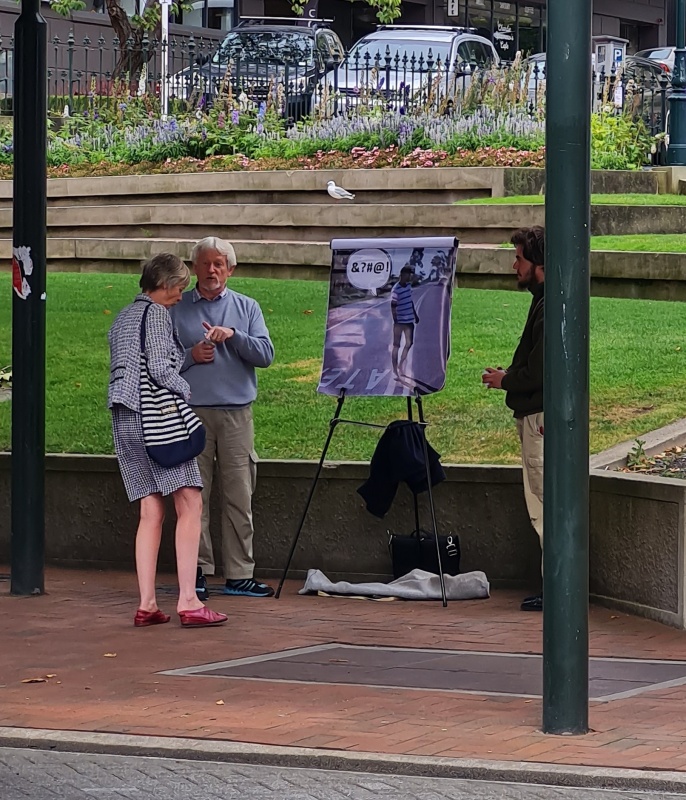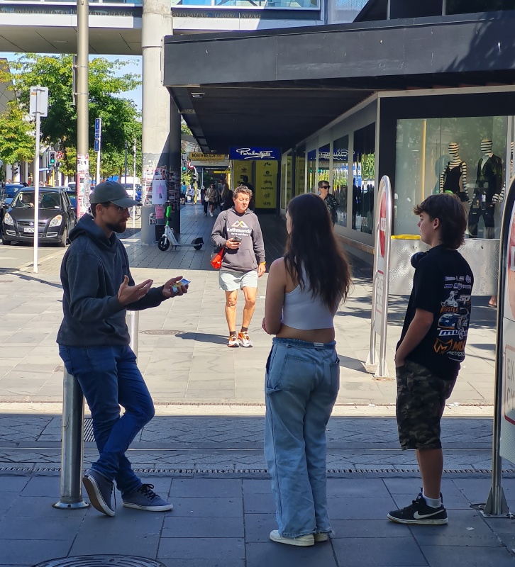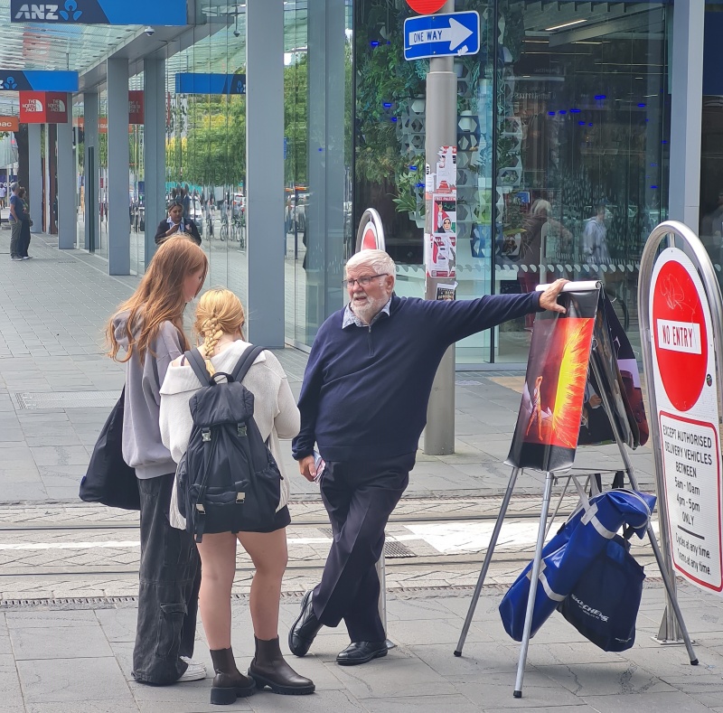 Friday’s outreach involved one of those special chats. It was hot! But bearable in the shade. Roger was with me. The busking festival has started now, so there were a lot of people out. Our usual spot at the Bridge of Remembrance was taken by buskers, so we moved down to the corner of Cashel and Colombo.
