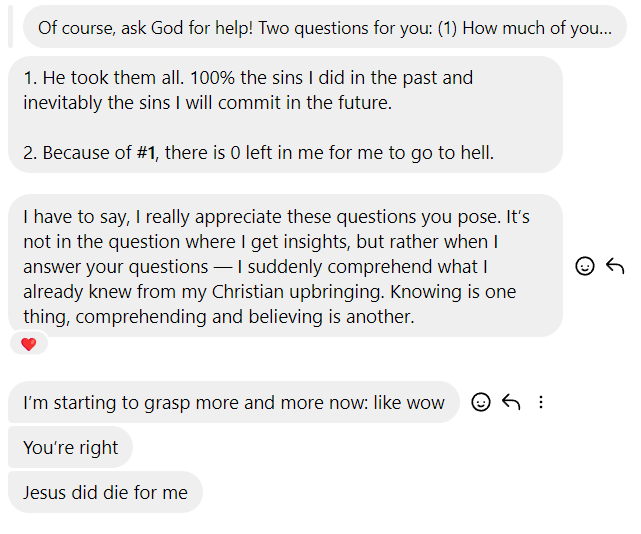 On Wednesday, 2 highlight chats were with 2 young ladies from Tauranga. I think there was some Adventist influence, because the sabbath came up. But I didn’t let that become a distraction from sharing the gospel. They also made professions. And then a chat with a young man from the UK - there was resistance from him, but he stuck around for 30 minutes as I walked him through all the check questions.