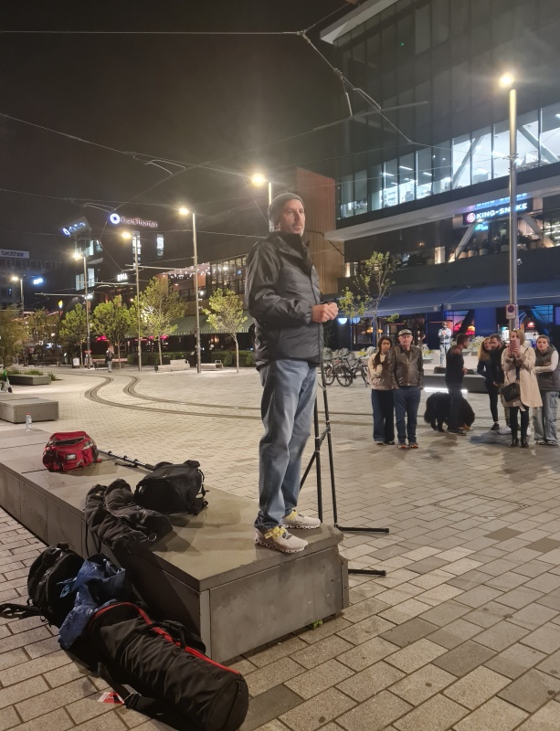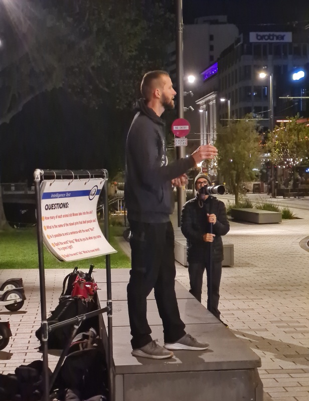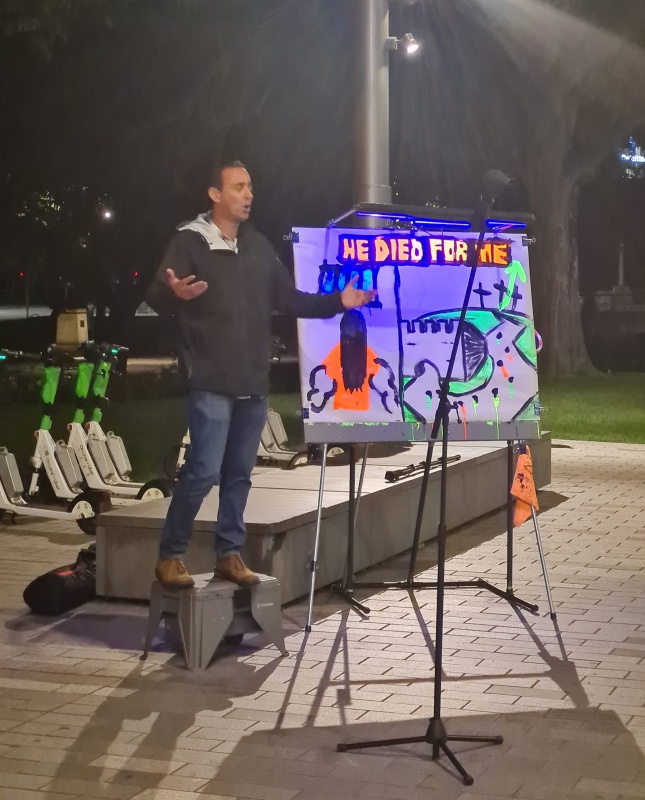 Sure enough, on Wednesday & Thursday evening, they were at the Bridge of Remembrance. There were quite a number of Christians who had turned up to say hello and see them in action. They focused on open air preaching, and used various techniques, including: trivia & giving away money, comedy & communication skills, flip charts and sketch boarding. Those who spoke included: EZ, Mark Spence, Oscar, Ben Price, Eddy Roman, and Chris Sandford from Living Waters Down Under. They all did an excellent job! Glory to God alone.