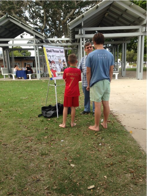 Two groups of young people asked questions about being a good person, and they received the gospel.  Several young men on the jetty heard the gospel, and later came to take Bibles.  Ruby and Renee, two young grade 6 girls, went through the Good Person Test and left with a Gospel of John each.