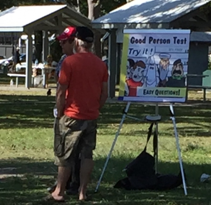 Two older ladies also went through the Good Person Test while the rest of their group moved on, openly scoffing. Originally they thought, as most people do, that they were good people, and that everyone goes to heaven. They said they tried to remain positive about what came after life, and they did not believe in any hell. As they moved through the Ten Commandments, they realized their guilt before God, and Michael showed them what Scripture teaches about hell, reading the verse from Revelation which tells of those whose place is in the lake of fire (Revelation 21:8). When they understood the existence of hell, they were rather concerned, but tried to brush it off. They heard the full Gospel, so now we pray that their hearts would be convicted, and that they would turn to Christ.