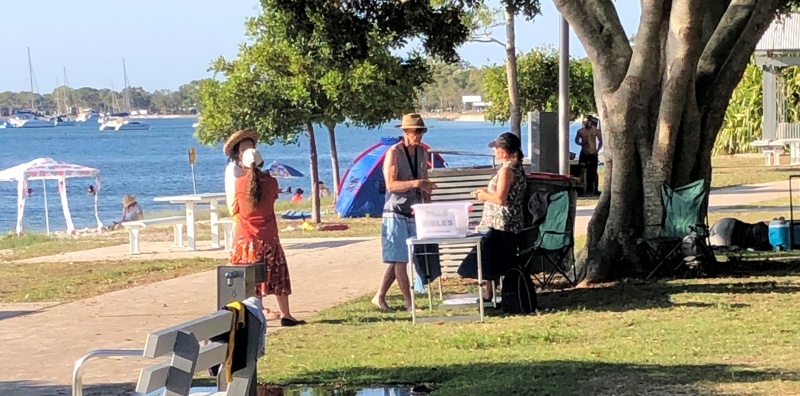 On Saturday afternoon, the team met on Bribie for a time of outreach. We were blessed to have four extra helpers, which was encouraging. It was a great privilege to have a pastor drive all the way down from Hervey Bay to share the Gospel, as well as another Christian who drove through 2 and 1/4 hours of heavy traffic to join us. The weather was on its best behaviour, there was a constant flow of people coming and going, and the general atmosphere seemed friendly and receptive. A large number of tracts went out, along with several Bibles and other literature. Many people stopped to talk and heard the Gospel. There were a large number of Christians who also passed us in the course of the afternoon and encouraged us in what we were doing, promised to pray for the outreach, or took tracts to distribute.