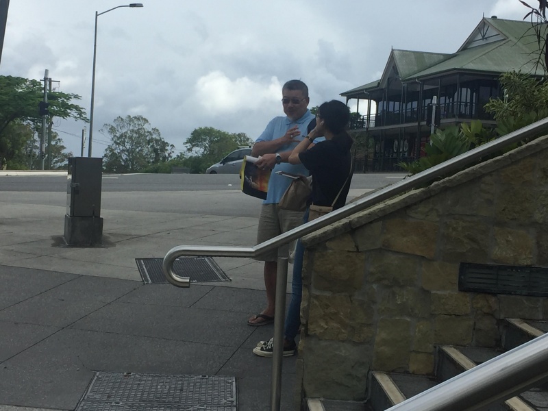 Today Johnny was away on vacation with family, so only Winnie and Hung were reporting duty on our roster Street gospel outreach ministry at Toowong. The weather was scorching hot as usual. It did affect the mood and temper of the gospel targets. They either hid under the shade in crowd that we can hardly break into them to have a chat, or they simply had no patience to get into any conversation. By God grace is always sufficient, both of us still managed to have many genuine and fruit bearing chat as recap below.