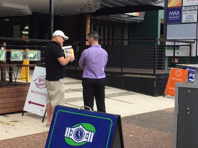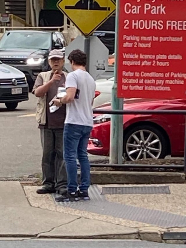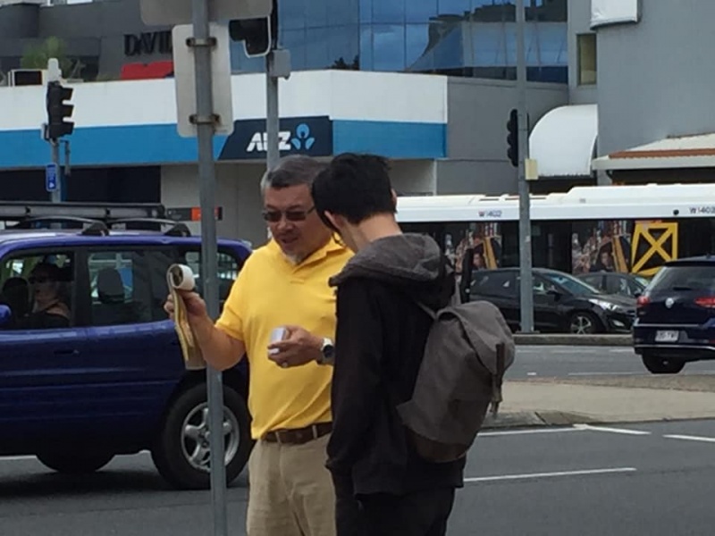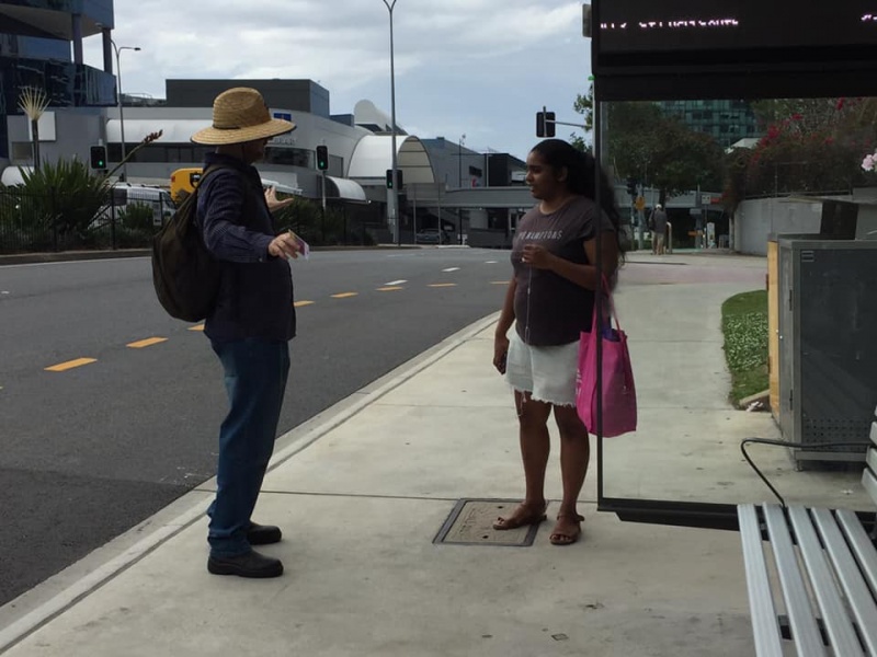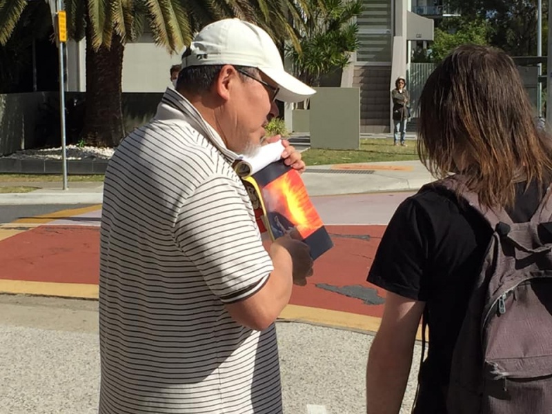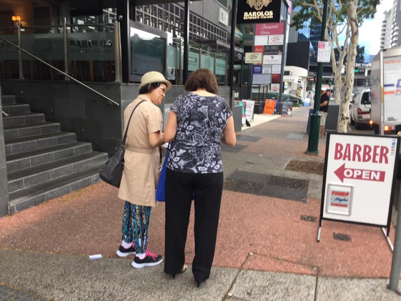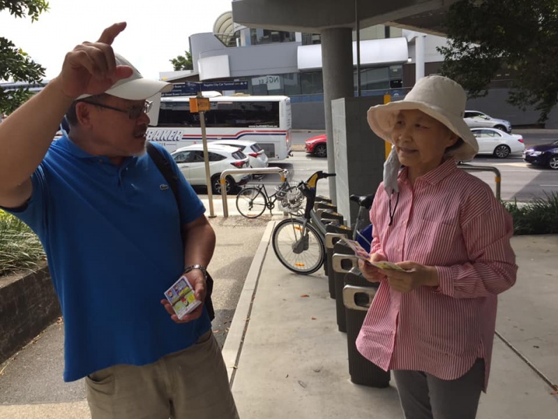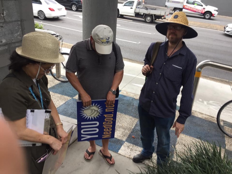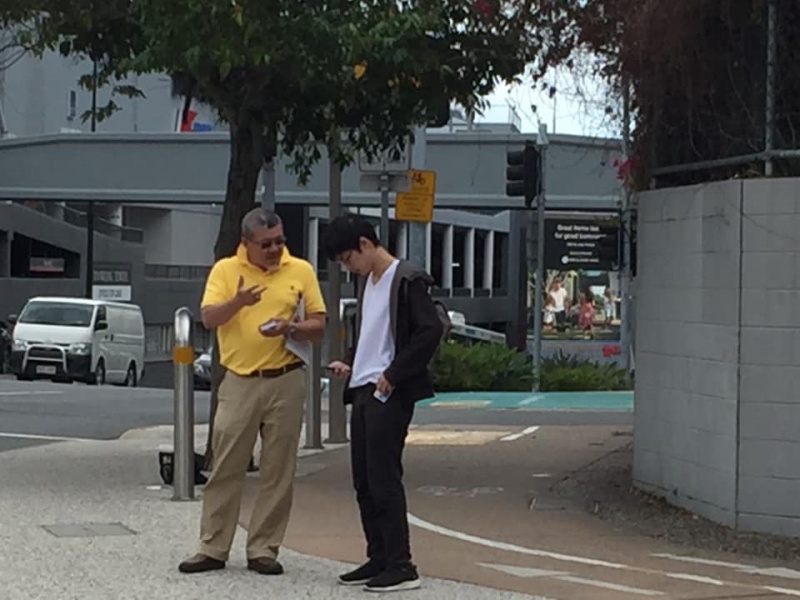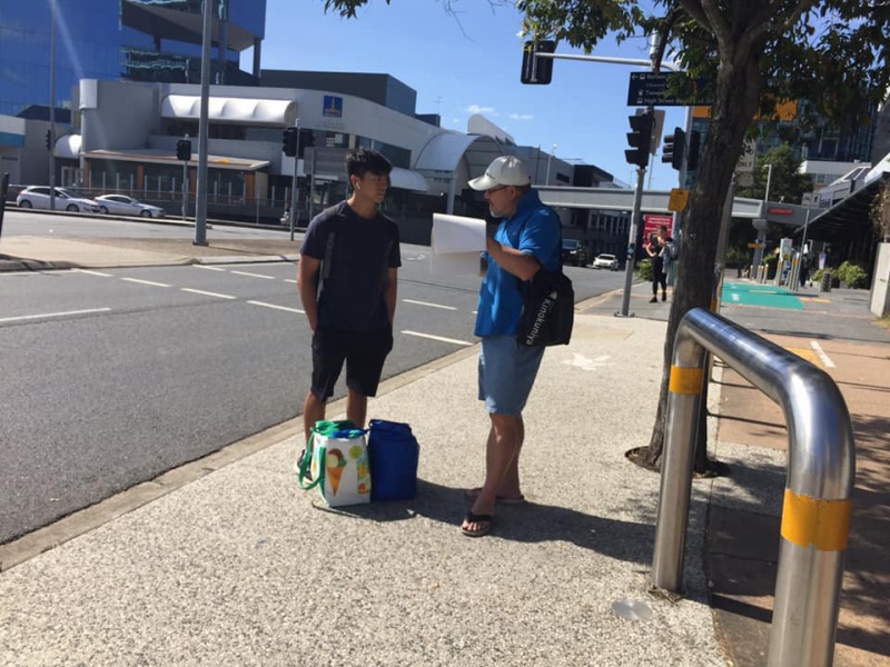 Today the team of three, Johnny , Winnie and Hung switched our mission venue to the Sherwood Street on the front of the main entrance of the Toowong Village. It was to avoid repeated encounter with many gospel targets at the Benson Street bus stop. Yet we unavoidably still meet up a couple of them. The chance of stopping for a chat was much less than the Benson Street Bus Stop. Johnny might have three or four, Winnie just two and I had 5 full chat with many shorter encounter as recap below: -