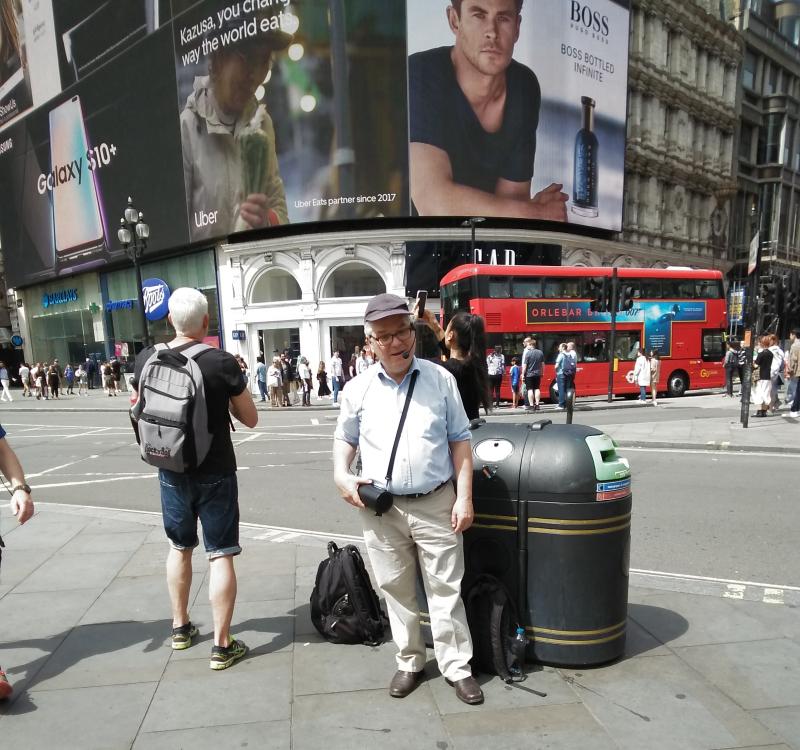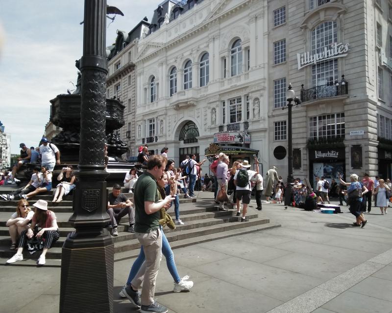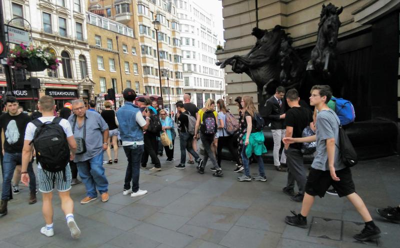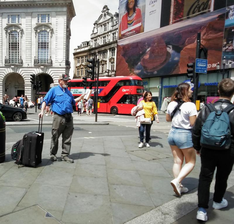 Gerry was already preaching when I got to Piccadilly Circus (fellow in the blue shirt.) I paired up with Gene from Mobile, Alabama, and we preached off to the side near the large fountain with the horses across from the Trocadero. Tourist season is well underway in London.