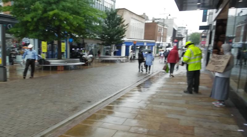 Operation 513 was in Stratford today. Jacob Moswa and I joined three members of the Sports Fan Outreach International in the rain. The SFOI guys took a break after four hours in the rain and I continued to preach and Jacob spoke to a number of people. Jacob and I both engaged with Samir, the Muslim outreach man. We didn't get very far with Samir, unfortunately, as he always badgers us to show where Jesus said that He is God. I mentioned John 8:24 and the 'ego eimi' statement of Jesus, but Samir wasn't accepting that. He asked Allah to make note that I was a liar, but we didn't get any further. Jacob showed Samir John 20:28 where Thomas says, "Ho Kyrious mou kai ho Theus mou", but that didn't impress him either.