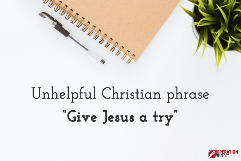 • Coming for a wrong reason: How can someone give Jesus a try to see if He will protect him from the eternal wrath that is to come? The person would have to die to actually "try" it out. Therefore, saying this phrase shows that the Christian is trying to get the unbeliever to come to Christ not to be saved from the wrath to come (right motivation), but to get a temporal earthly benefit of being a Christian - love, joy, friendship, etc (bad motivation).